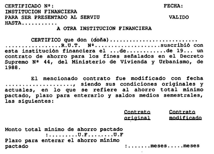 El "Certificado de mantención de cuenta de ahorro a plazo para la vivienda Decreto Supremo N° 44, de 1988, del Ministerio de Vivienda y Urbanismo", deberá extenderse de acuerdo al formato adjunto.