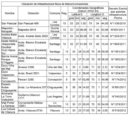 1. Autorízase a la concesionaria para instalar, operar y explotar un Servicio Intermedio de Telecomunicaciones, que únicamente provea infraestructura física para telecomunicaciones, por medio de instalaciones y redes destinadas al efecto, tal como sigue: