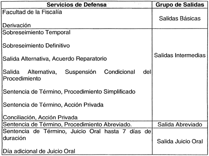 . Los servicios antes detallados corresponden a la tipología utilizada por la Defensoría Penal Pública para determinar el tipo de prestación que entrega, singularizándose cada uno de ellos por el nombre de la audiencia en la que se produce el término, debidamente ejecutoriado.