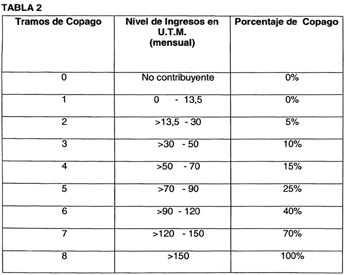 . 8º De los Tramos de Copago del Beneficiario: La contribución por parte del beneficiario al pago de la tarifa fijada para el servicio de defensa penal se establecerá en función de los tramos de copago especificados en la siguiente tabla y su adscripción a uno de ellos, determinada mediante los datos socio-económicos requeridos según lo establecido en la presente resolución.