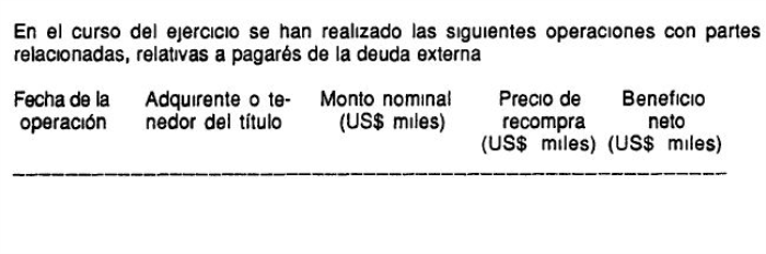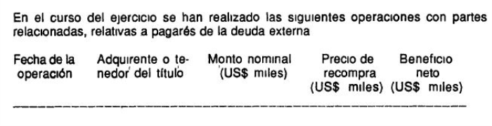 Si bien la redacción de esta parte de la nota queda a criterio de cada institución, al tratarse de operaciones con pagarés de la deuda externa efectuadas con personas relacionadas, deberá presentarse la información respecto a esas operaciones, de la siguiente forma.