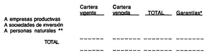 (2): Si la cantidad de créditos es mínima y la agrupación de cifras no justifica la presentación del cuadro porque la mayoría de sus espacios no contendrían saldos, se podrá presentar la información en otra forma, siempre que se indiquen todos los datos pertinentes exigidos en el modelo.