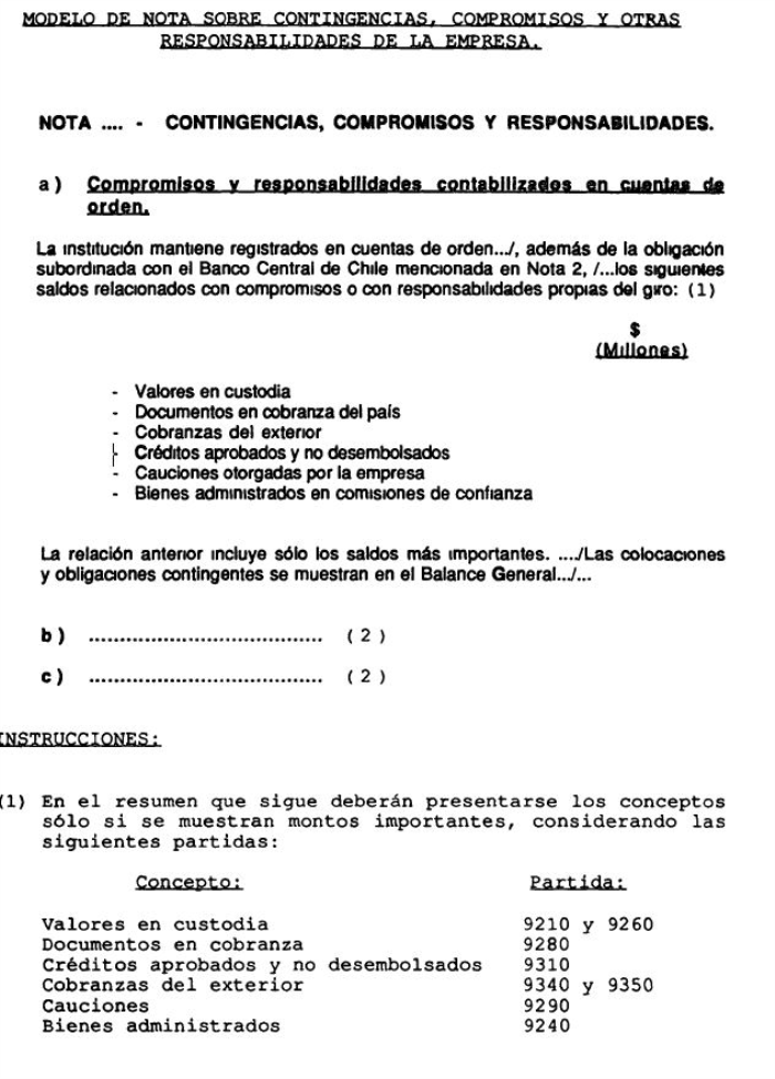 E) En el Anexo N° 13 del CAPITULO 18-1, se actualiza el modelo e instrucciones de la nota sobre contingencias, compromisos y responsabilidades, eliminando la mención a partidas que no se encuentran vigentes.