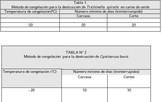 a) Las carnes previamente refrigeradas a 4ºC o menos, podrán ser congeladas a las temperaturas indicadas y tiempos señalado en las Tablas 1 y 2 de este mismo anexo.