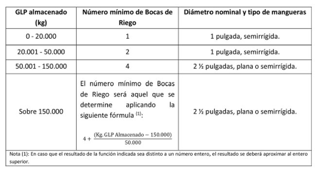 El número mínimo de Bocas de Riego y el diámetro nominal y tipo de mangueras será el indicado en la Tabla 3., definida según la capacidad de almacenamiento. Cada Boca de Riego deberá tener como mínimo una manguera.