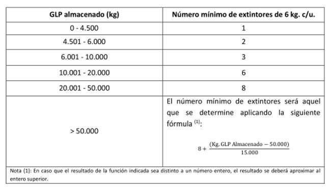 El número mínimo de extintores será el indicado en la Tabla 4. definida según la capacidad de almacenamiento.