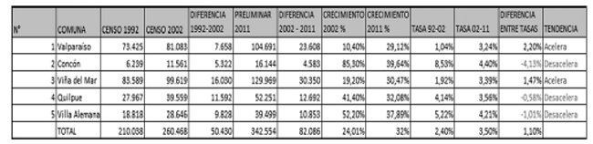. Los presentes datos indican cambios en el proceso de metropolización, transformándose los patrones de crecimiento urbano. En el periodo comprendido entre los años 1992 y 2002, se experimenta el crecimiento acelerado de las comunas residenciales (dormitorio) del Gran Valparaíso, que son Quilpué, Villa Alemana y Concón, conformándose un proceso de expansión de la superficie urbanizada. En este periodo, la Comuna de Valparaíso llega incluso a perder población, mientras Viña del Mar, crece de manera discreta. Por el contrario, a partir de 2002, las comunas de expansión del Gran Valparaíso, desaceleran su crecimiento en lo que a vivienda se refiere, mientras que las comunas céntricas (Valparaíso y Viña del Mar) experimentan un considerable incremento en sus tasas de crecimiento residencial.