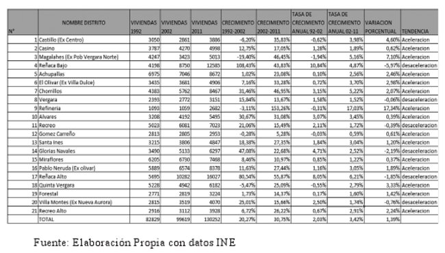 Se realizó un análisis comparativo por distrito censal dentro de Viña del Mar, utilizando los datos de los censos del 1992, 2002 y el precenso de 2011. El análisis permite visualizar una clara tendencia de la comuna, que es coherente con lo experimentado por todo el Gran Valparaíso, respecto al crecimiento residencial de las áreas céntricas. Cabe destacar que en este escenario, pese a la densificación del centro de Viña del Mar, resulta evidente que todos los barrios siguieron creciendo en vivienda como consecuencia de la localización central que ocupa la comuna en su conjunto, dentro del Gran Valparaíso. De esta manera, es posible observar las siguientes tendencias.