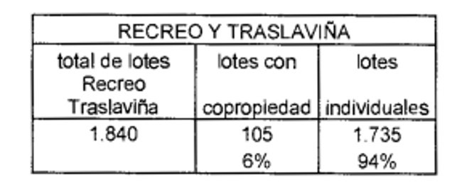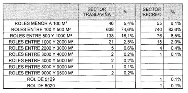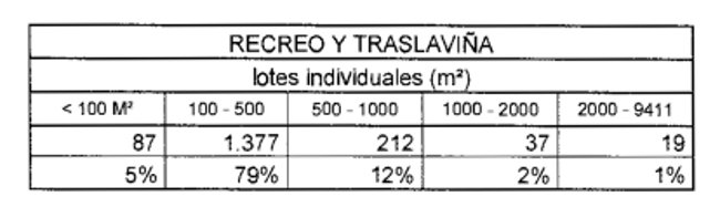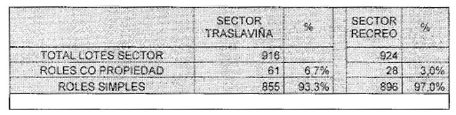 Para realizar un análisis de la vulnerabilidad de ambos sectores, frente a la presión del mercado inmobiliario, se procedió a analizar los lotes del territorio en función de su tamaño, su capacidad de fusión y su ubicación en función de la manzana y la vialidad del sector. Como una premisa inicial se consideró como lotes "duros" aquellos en régimen de copropiedad, los que representan alrededor del 6%, restándose del total aquellos registrados en esta condición. En el siguiente cuadro se aprecian los totales de lotes tanto del sector Traslaviña como del sector Recreo