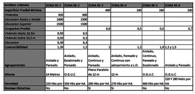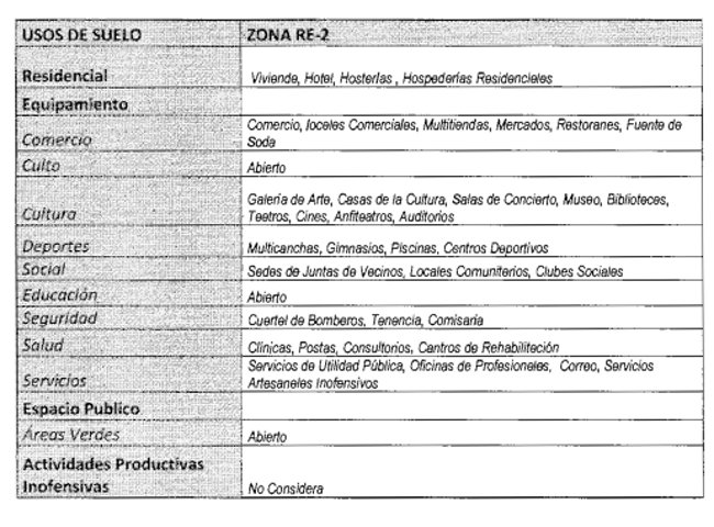 Según lo anterior, la propuesta considera ajustar los parámetros (normas urbanísticas) de altura, densidad y constructibilidad de la zona RE-2, quedando de la manera expuesta en el siguiente cuadro:
