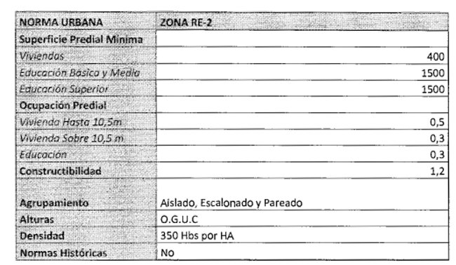 D. La Zona RE-2 Presenta una estructura predial, que ofrece poca resistencia al cambio. Posee lotes intermedios, con edificaciones bajas que no superan los 2 pisos, muchas de ellas de estructura blanda (madera y adobe) y obsoletas desde el punto de vista de los programas habitacionales. Estos cuatros factores se conjugan para el ingreso de nuevos proyectos inmobiliarios a la zona, pese a sus condiciones de edificación