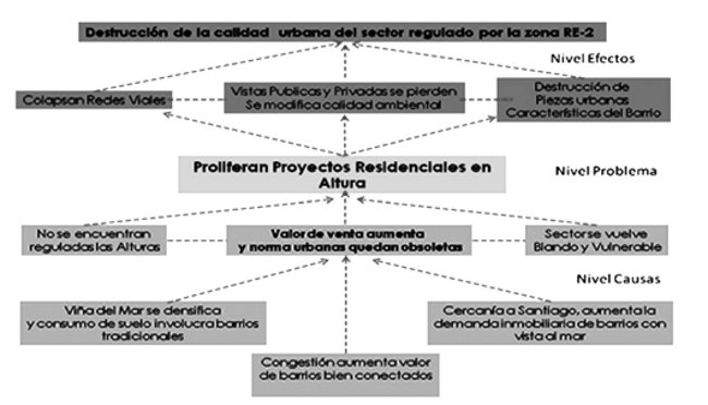 Los fenómenos recientemente descritos, demuestran que la normativa urbana estipulada por la zona RE-2 ha quedado obsoleta. El contexto urbano para la cual fue pensada, ha cambiado y por tanto ya no cumple con los objetivos para los cuales fue propuesta. A continuación se expone un árbol de problemas que sintetiza lo descrito