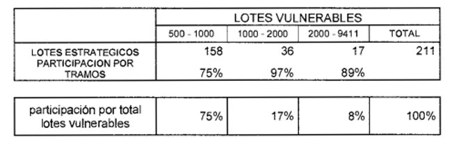. De acuerdo a lo anterior, del total de lotes de ambos sectores de tamaño superior a los 500 m², calificaron como vulnerables el 75 % de los lotes entre 500 y 1000 m². Para los tramos superiores, entre 1000 y 2000 m2, el 97%. Por último son vulnerables, el 89 % de los lotes superiores a los 2000 m². La siguiente gráfica permite visualizar el total de los lotes considerados vulnerables.