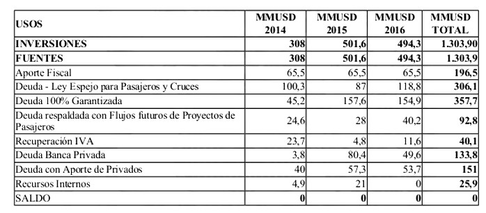 El Plan Trienal de Inversiones se financia mediante Aportes Fiscales, Endeudamiento con 100% Garantía del Estado, Venta de Activos, Convenios provenientes de la Ley Espejo Transantiago y Bonos de Carbono, de acuerdo a la siguiente distribución:Decreto 121