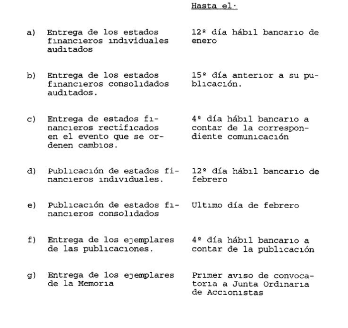 "Las instituciones fiscalizadas deberán enviar a esta Superintendencia, debidamente firmados, sus estados financieros individuales y el correspondiente informe de los auditores externos, a más tardar el duodécimo día hábil bancario del mes de enero.