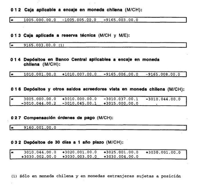 "Por consiguiente, son computables como encaje mantenido todos los saldos en moneda chilena que se incluyan, conforme a las normas vigentes, en las siguientes cuentas: i) las de la partida 1005, con excepción de la cuenta "Depósitos en custodia en otras instituciones financieras", y, ii) las cuentas "Depósitos en cuenta corriente en el Banco Central de Chile" y "Remesa de efectivo en tránsito al Banco Central", ambas de la partida 1010.".