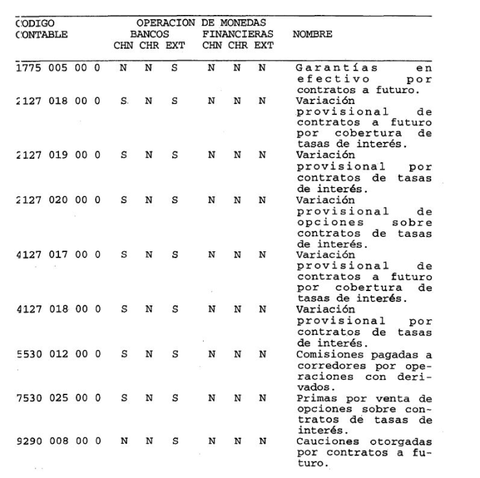 En este Capítulo se han refundido las instrucciones correspondientes a operaciones con instrumentos derivados en el mercado internacional, tanto de moneda extranjera como de tasas de interés, unificándose algunos registros contables que son comunes a los instrumentos derivados, como, por ejemplo, la constitución de garantías en efectivo o con carta de crédito stand by por operaciones en Bolsas Oficiales Extranjeras y las remesas de fondos entre el banco que contrata y los corredores. Además, con el objeto de agrupar los saldos correspondientes a operaciones a futuro, se cambian de las partidas de Activo y Pasivo Transitorio a las partidas 2127 y 4127, los ajustes provisionales de los contratos correspondientes a tasas de interés.