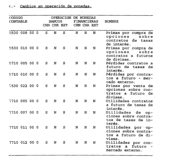 Por otra parte, dado que las normas del Banco Central de Chile permiten utilizar, en estas operaciones, moneda extranjera no adquirida en el mercado bancario formal y permiten no retornar y liquidar la moneda extranjera obtenida, se han simplificado las instrucciones contables admitiendo la imputación directa en moneda extranjera o en moneda chilena, según proceda.