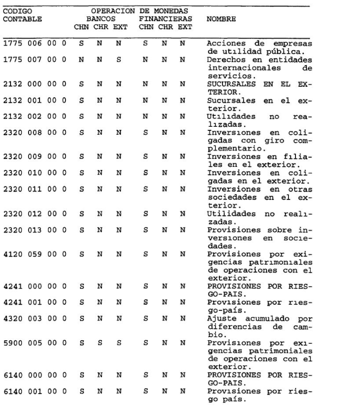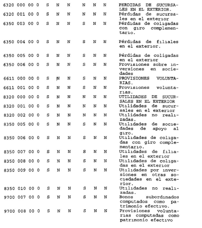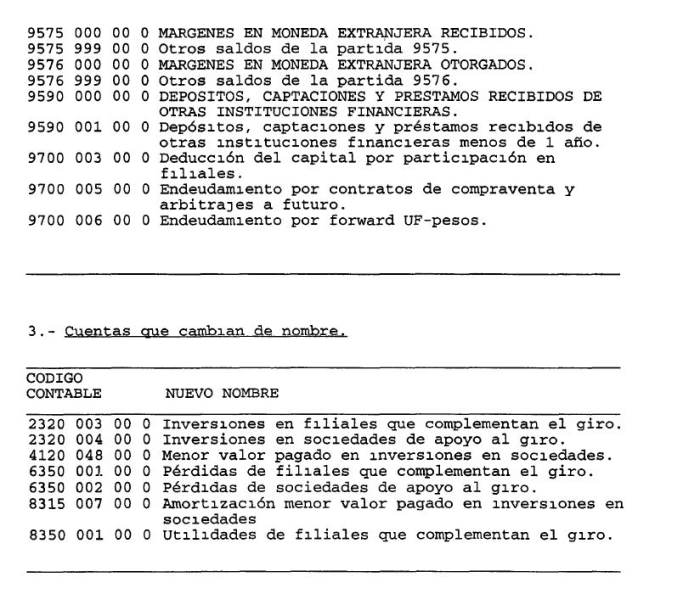 Por tratarse de partidas en desuso, se eliminan del Sistema de Información de esta Superintendencia, a contar de la información referida al 31 de enero de 1998, las siguientes: 2135 "Letras del Banco Central por venta de cartera"; 4215 "Provisión obligación subordinada con el Banco Central"; 6610 "Excedente para obligación subordinada con el Banco Central", 7350 "Letra del Banco Central por venta de Cartera"; 9190 "Garantía de los Directores", 9465 "Obligación subordinada a favor del Banco Central de Chile", 9575 "Márgenes en moneda extranjera recibidos"; 9576 "Márgenes en moneda extranjera otorgados"; y 9590 "Depósitos, captaciones y préstamos recibidos de otras instituciones financieras".