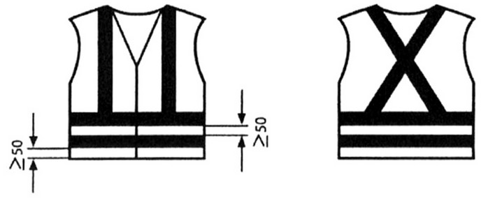 b) Una banda horizontal que rodee el torso, y bandas que unan aquélla de adelante hacia atrás por sobre cada hombro. La parte baja de la banda del torso debe estar a una distancia mínima de 50 mm del borde inferior del chaleco.
