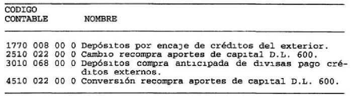 Las obligaciones que las entidades financieras contraigan con otras, por la obtención de créditos documentados en moneda extranjera pagaderos en pesos, serán registradas en la misma moneda en que ellos estén documentados con cargo a la cuenta "Conversión Créditos Externos -V.B.1 CNF", en tanto que la moneda chilena recibida será registrada con abono a la cuenta "Cambio Créditos Externos-V.B.1 CNF".