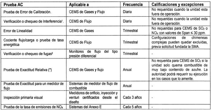 Las pruebas requeridas para el sistema de aseguramiento de calidad en CEMS de gases, se resumen en la tabla Nº 1, de estas pruebas solo la prueba anual de Exactitud Relativa deberá ser realizada por una entidad técnica de fiscalización ambiental autorizada para dichos efectos. Para el resto de las pruebas, el titular podrá ejecutarlas de manera interna con personal de planta o bien contratar los servicios de una entidad técnica de fiscalización ambiental, según estime conveniente.
