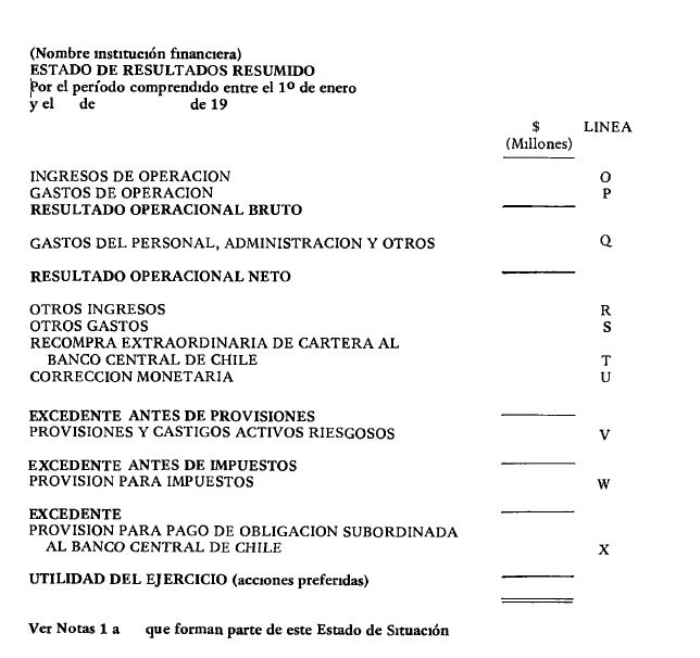 El modelo del estado de resultados que debe utilizarse contiene, sin embargo, menos líneas que aquel correspondiente al ejercicio anual La diferencia está sólo en la presentación resumida de las líneas signadas con las letras O, P y Q, de tal manera que los importes que corresponde consignar en cada una de estas líneas corresponderán a la suma de aquellos que se identifican con las mismas letras en el estado de resultados no resumido indicado en el Anexo N° 1 del Capítulo 18-1 (por ejemplo línea Q = Q1 + Q2 + Q3)