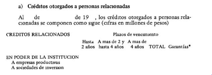 Según lo dispuesto en el artículo 3° transitorio de la Ley N° 18576 y en el Capítulo 12-4 de la Recopilación Actualizada de Normas de la Superintendencia de Bancos e Instituciones Financieras, existe un plan de desconcentración para los créditos con partes relacionadas Para los efectos del cumplimiento de ese plan, la institución podía mantener al de de 19 , créditos con partes relacionadas hasta por el equivalente al % del capital pagado y reservas A esa misma fecha, la empresa mantenía créditos con partes relacionadas por el equivalente a un % del capital pagado y reservas En consecuencia, esta entidad /no/ ha cumplido, a la fecha de los presentes Estados Financieros, con el plan de desconcentración dispuesto por el Organismo Contralor
