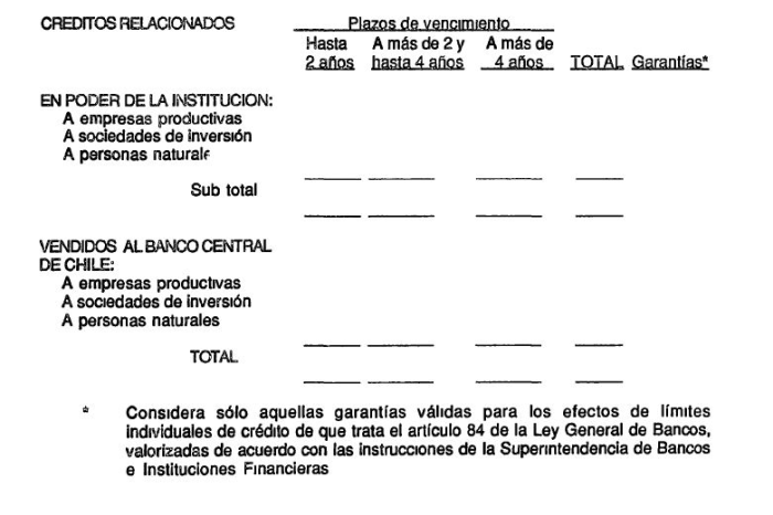 (1): Los montos señalados en estos párrafos deben referirse a los importes informados al cierre del ejercicio anterior. En el caso de la empresa que mantiene cartera vendida al Banco Central de Chile, deberá remplazarse el cuadro antes señalado por el siguiente, utilizando, en lo demás, la misma redacción: