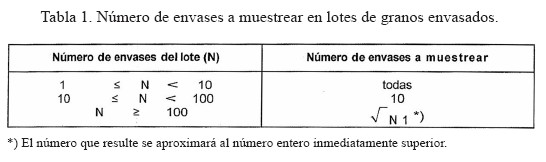 Por cada lote se deberá calcular el número de envases a muestrear, de acuerdo a lo establecido en la siguiente tabla 1.