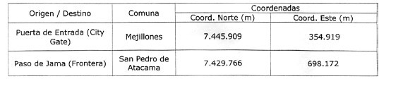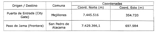 Segundo: Reemplázase la letra a) "Puntos de origen y destinos de la ruta Paso de Jama-Mejillones" del artículo segundo del DS Nº 337 de 1997, del Ministerio de Economía, Fomento y Reconstrucción, relativa a la identificación de las coordenadas de los puntos de origen y destino del gasoducto, por la siguiente: