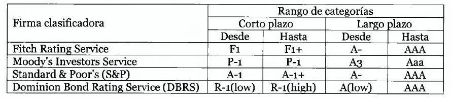 La siguiente es la nómina de las empresas calificadoras internacionales conformada para los efectos contemplados en los artículos 67, 78 y 84 de la Ley General de Bancos. Esta nómina incluye el rango de categorías específicas establecido por cada una de esas firmas y que darán la calidad de "primera categoría" o "la más alta categoría" a que se refieren los artículos antes mencionados: