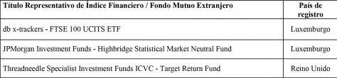 . 2. Desaprobar los siguientes títulos representativos de índices financieros y cuotas de fondos mutuos extranjeros, debido a que no cuentan con activos por un monto igual o superior a los US$ 100 millones: