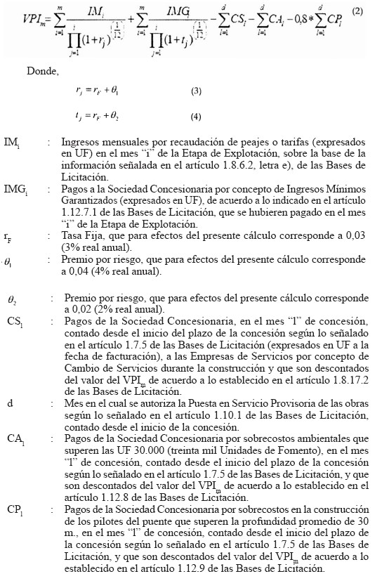 . Donde el término VPIm corresponde al Valor Presente de los Ingresos de la Sociedad Concesionaria (expresados en UF), calculado en el mes "m" de concesión, contado desde la fecha de autorización de la Puesta en Servicio Provisoria de las obras, señalada en el artículo 1.10.1 de las Bases de Licitación (el mes en que se autoriza la Puesta en Servicio Provisoria de las obras es m=1), y actualizado al mes anterior al de dicha autorización de Puesta en Servicio Provisoria de las obras, e ITC se refiere a los Ingresos Totales de la Concesión ofertados por el Licitante Adjudicatario en su Oferta Económica, por un valor de UF 3.325.000 (tres millones trescientas veinticinco mil Unidades de Fomento), según se señala en el artículo 3.2.2 de las Bases de Licitación.