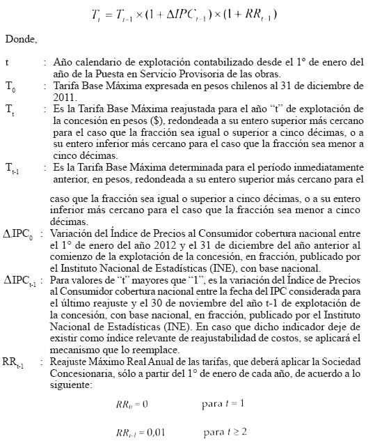 El valor de la Tarifa Base Máxima se reajustará a partir del 1º de enero de cada año de explotación o cada vez que se compruebe una inflación acumulada desde la última revisión tarifaria igual o superior al 15%. En este último caso la Tarifa Base Máxima se reajustará en un valor igual a dicha inflación acumulada. Para el cálculo de la Tarifa Base Máxima, en pesos, reajustada se usará la siguiente expresión: