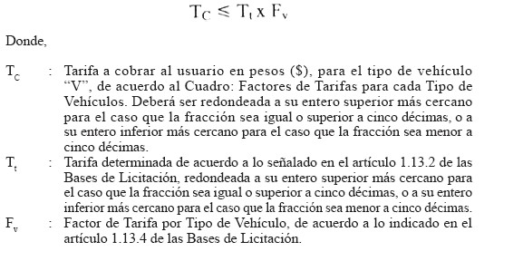 . De conformidad a lo indicado en el artículo 1.13.5 de las Bases de Licitación la tarifa máxima a cobrar al usuario, por tipo de vehículo, será la resultante de aplicar el factor que corresponda según lo señalado en 1.13.4 a la Tarifa Base Máxima reajustada de acuerdo a lo establecido en 1.13.2, ambos artículos de las Bases de Licitación, de acuerdo a lo indicado en la siguiente fórmula: