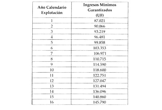 .iii) Percibir un Ingreso Mínimo Garantizado ofrecido por el Estado, cuando procediere, de acuerdo a lo expresado en los artículos 1.12.7 y 1.12.7.1 de las Bases de Licitación, cuyo monto para cada año de explotación de la concesión se indica en el cuadro siguiente:
