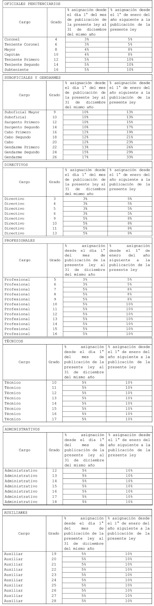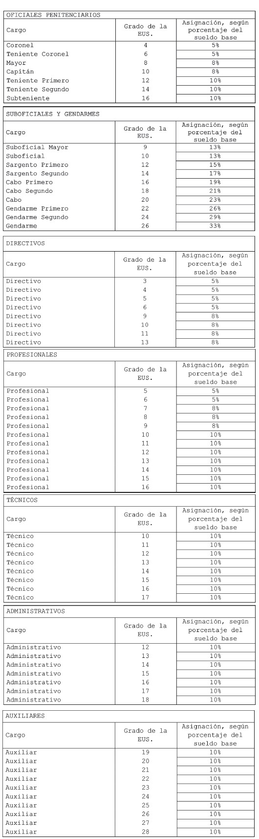 Los montos que se percibirán por concepto de la referida asignación corresponderán al porcentaje del sueldo base de cada grado de la Escala Única de Sueldos asignado al cargo, conforme a la distribución que a continuación se indica: