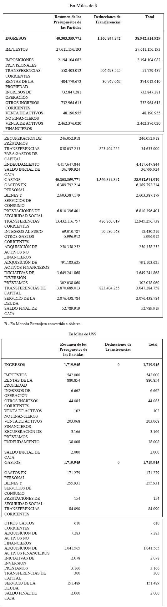 Artículo 1º.- Apruébase el Presupuesto de ingresos y gastos del sector público, para el año 2015, según el detalle que se indica: