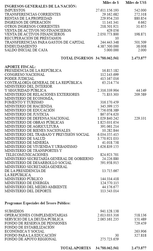 Artículo 2º.- Apruébanse los Ingresos Generales de la Nación y los Aportes Fiscales en moneda nacional y en moneda extranjera convertida a dólares, para el año 2015, a las Partidas que se indican: