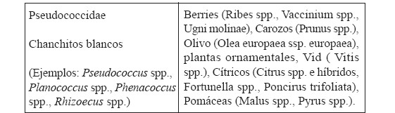4.1. En la columna plaga, en el ítem insectos, reemplácese el nombre de la especie Pseudoccocidae por Pseudococcidae e inclúyanse los siguientes ejemplos de especies que pertenecen a esa familia, quedando como sigue: