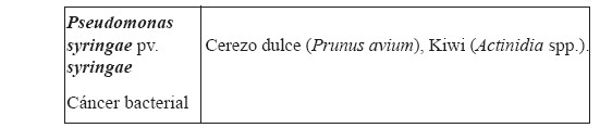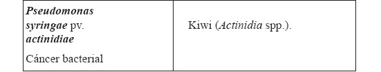 4.3. En la columna hospedante, en el ítem bacterias, agréguese a la especie Pseudomonas syringae pv. syringae, el hospedante Kiwi (Actinidia spp.),quedando como sigue: