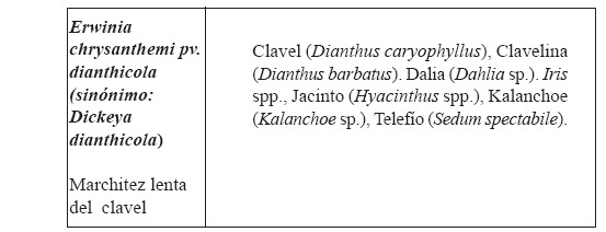4.4. En la columna hospedante, en el ítem bacterias, agréguese a la especie Erwinia chrysanthemi pv. dianthicola, los siguientes hospedantes: Clavelina (Dianthus barbatus), Kalanchoe (Kalanchoe sp.), Telefío (Sedum spectabile), Dalia (Dahlia sp.), y modifíquese Clavel (Dianthus spp.) por Clavel (Dianthus caryophyllus). Además, agréguese como sinonimia, a la especie Erwinia chrysanthemi pv. dianthicola y entre paréntesis, Dickeya dianthicola, quedando como sigue: