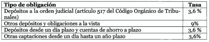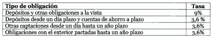Los depósitos y otras captaciones u obligaciones en moneda nacional sujetos a encaje estarán afectos a las siguientes tasas: