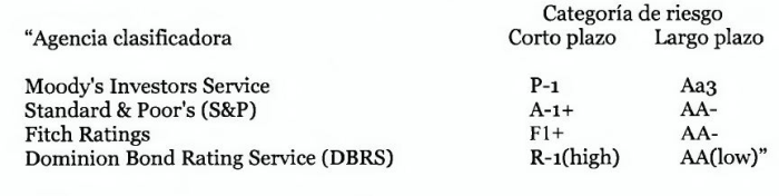 A fin de actualizar las instrucciones referidas a las categorías de riesgo de las agencias clasificadoras internacionales, se sustituye el cuadro que aparece en el numeral 1.3 del Capítulo 12-15, por el siguiente: