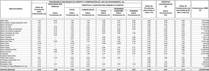 (1) A partir de enero de 2008 los índices de provisiones por riesgo de crédito consideran la nueva clasificación contable de las Colocaciones, además de los Créditos contingentes que se informan fuera de Balance. Por consiguiente, Colocaciones se define como la suma de los conceptos contables Adeudado por Bancos y Créditos y cuentas por cobrar a clientes, ambos brutos de provisiones. A partir deenero de 2011, el rubro Adeudado por Bancos, para efectos del cálculo de provisiones, no incorpora al Banco Central de Chile.