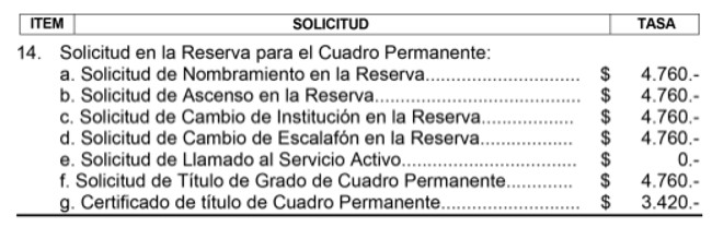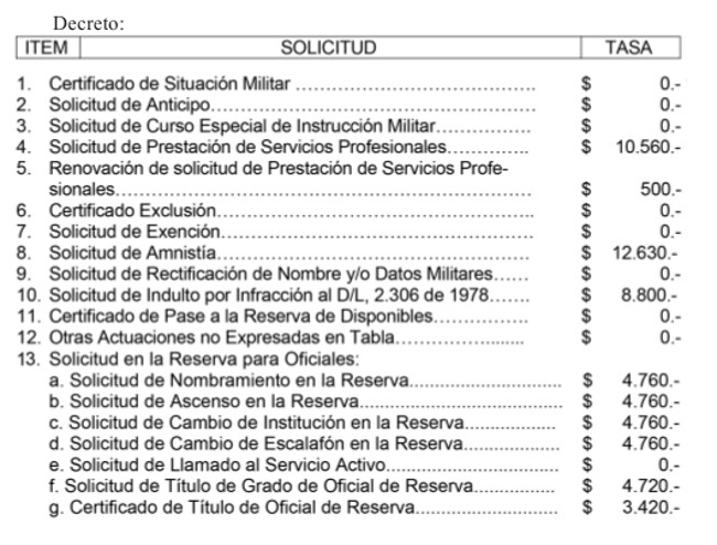 FIJA TASAS DE DERECHOS A SOLICITUDES Y ACTUACIONES DEL DECRETO Nº 2.306, DE 1978, QUE DICTA NORMAS SOBRE RECLUTAMIENTO Y MOVILIZACIÓN DE LAS FUERZAS ARMADAS