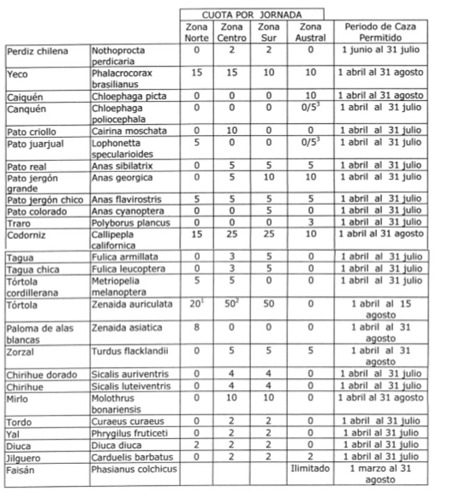 "Artículo 5º.- Se autoriza la caza en las cuotas máximas por jornada y por cazador, en las distintas zonas en que se divide el país, y sus temporadas de caza permitida; respecto de las especies que a continuación se enumeran: