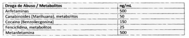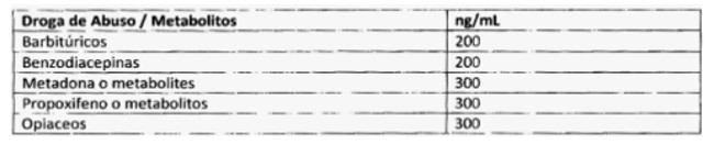 El ISP, recomienda para el tamizaje de drogas de abuso o de sus metabolitos en orinas, el uso de los niveles de corte establecidos por el SAMHSA y el EWDTS (European Workplace Drug Testing Society), de acuerdo a las siguientes tablas:
