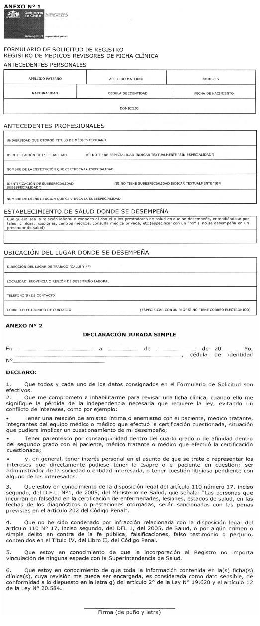 Para efectuar la inscripción en el Registro de Médicos Cirujanos que podrán ser designados para revisar las fichas clínicas, el solicitante deberá llenar todos los datos requeridos en el "Formulario de Solicitud de Registro" y suscribir la "Declaración Jurada Simple", cuyos formatos y contenidos se encuentran en los Anexos Nº 1 y 2, respectivamente, de este Título, estando ambos a disposición del público general en el sitio web de la Superintendencia de Salud (www.supersalud.gob.cl).